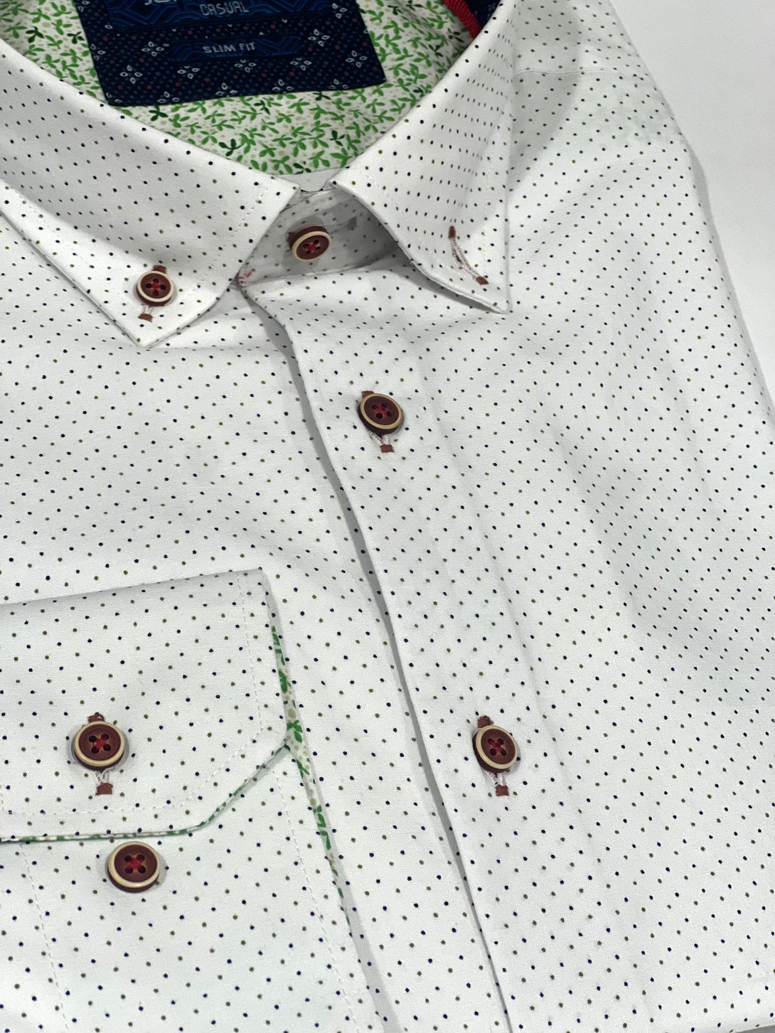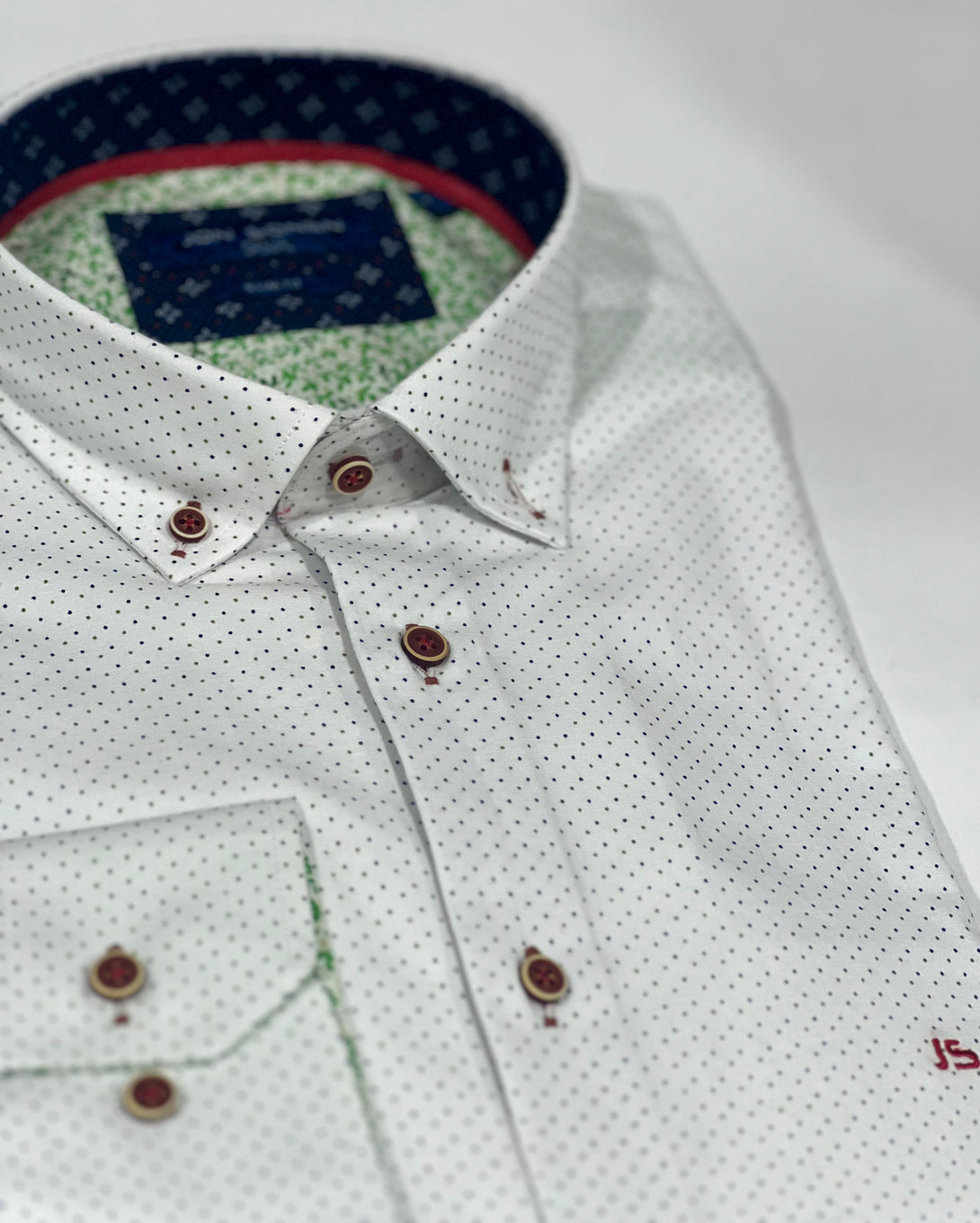 Camisa de hombre en tono blanco con un sutil microdiseño geométrico que aporta elegancia y modernidad. Su confección en algodón y poliéster de alta calidad garantiza frescura, comodidad y un ajuste impecable. Presenta cuello tipo button down, bordado JS en el pecho y contraste decorativo en la tapeta interna y cuello en tonos azul marino y rojo. Los botones en tono madera realzan su estilo sofisticado.