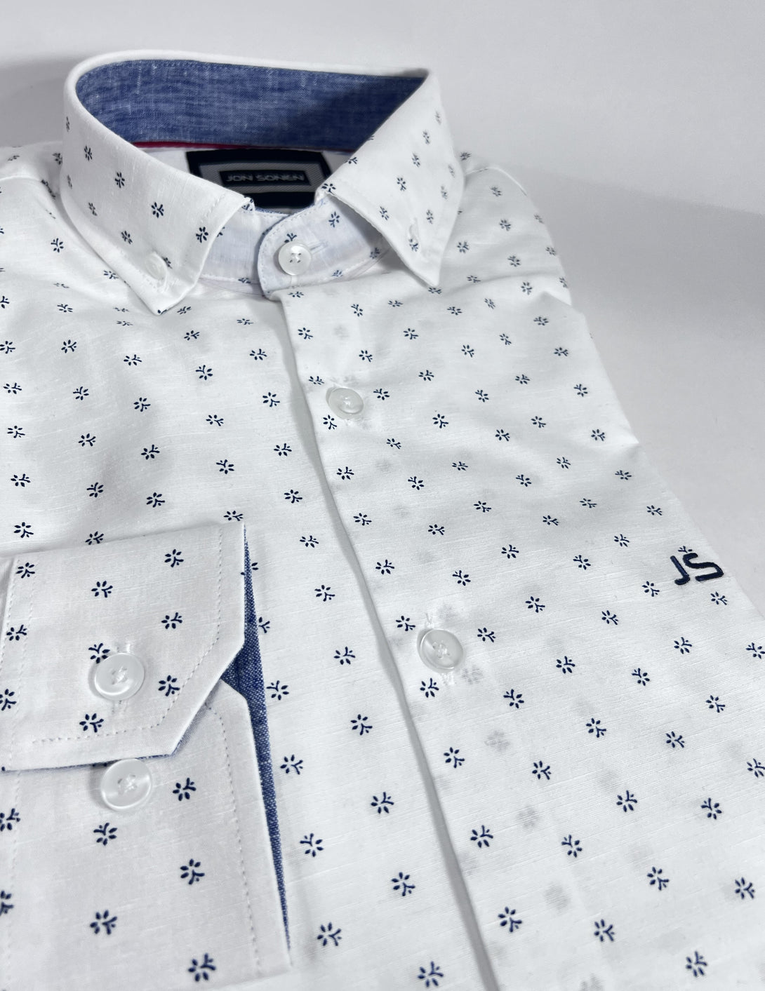 Camisa elegante y versátil en tono blanco con un delicado diseño de microestampado azul, ideal para dar un toque moderno y sofisticado a tu look. Confeccionada en tela ligera y fresca, de corte clásico y manga larga, cuenta con cuello con botones y detalles en contraste en la parte interna, lo que realza su estilo exclusivo. Incorpora bolsillo frontal con solapa y bordado de la marca JS, garantizando autenticidad y distinción.