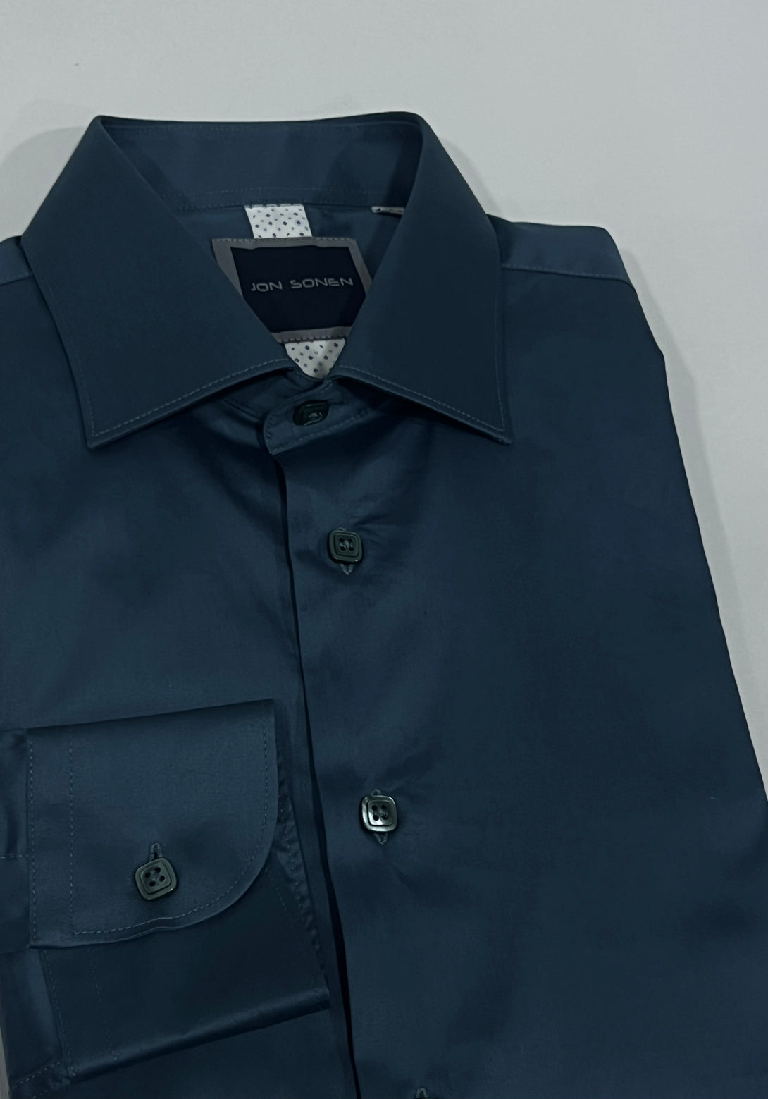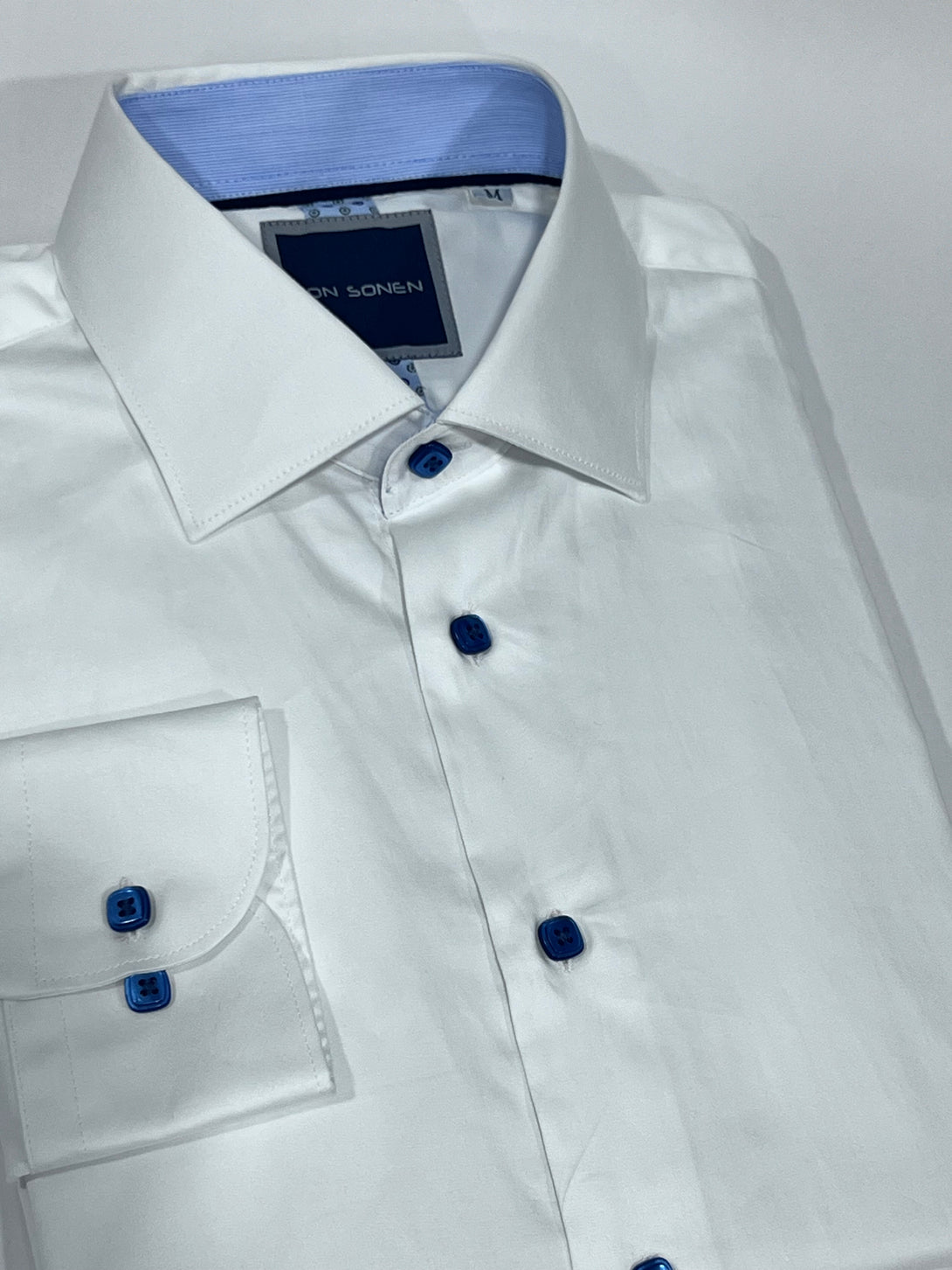 El corte moderno y ajustado realza la figura, mientras que los detalles clásicos, como el cuello estructurado y los puños abotonados, aportan un toque refinado. Perfecta para combinar con pantalones de vestir o jeans, esta camisa se convertirá en un básico imprescindible en tu guardarropa.