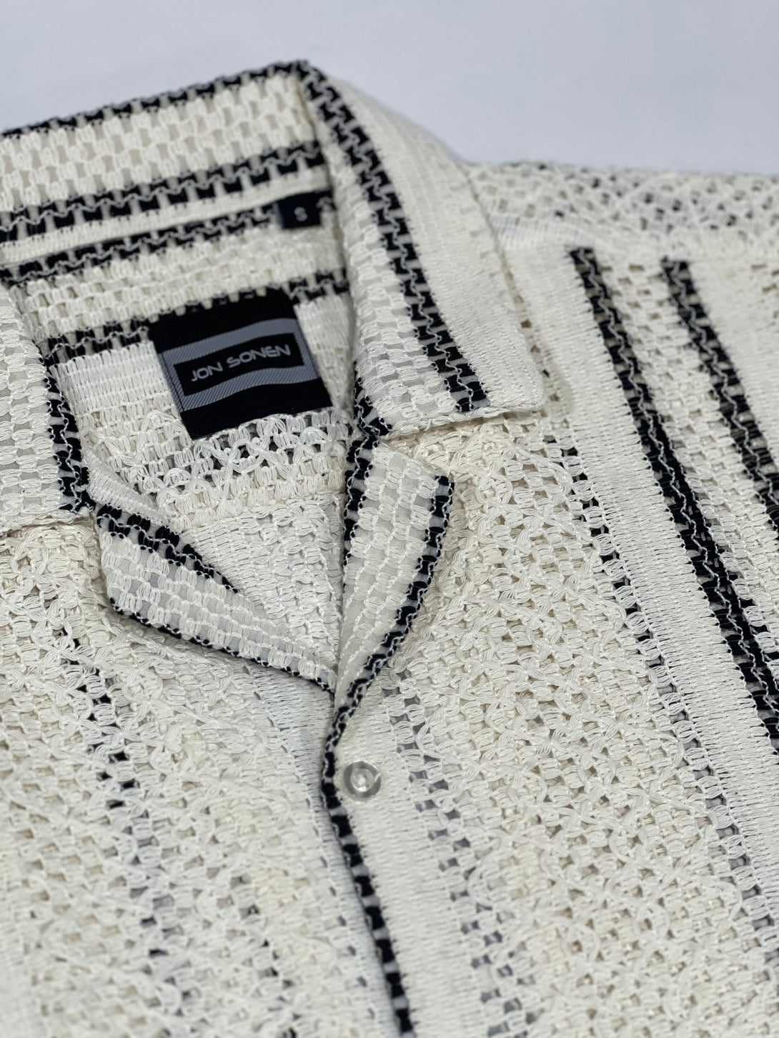 Resalta tu estilo con esta camisa sport tejida Jon Sonen, confeccionada en una mezcla ligera de 65% poliéster y 35% algodón, ideal para brindar frescura, suavidad y comodidad durante todo el día. Su diseño calado con líneas verticales en contraste le da un toque moderno y artesanal, perfecto para looks casuales con un aire elegante.